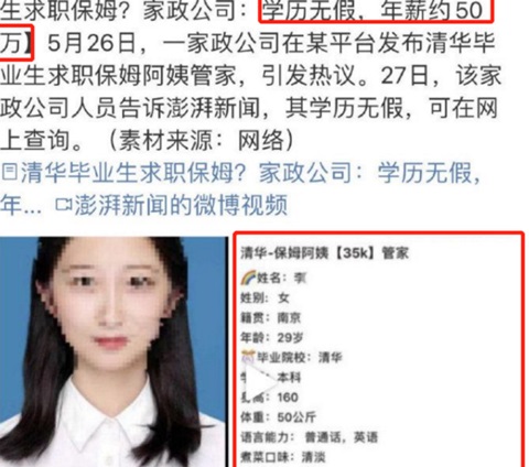 중국 명문대 칭화대 졸업생이 구직 사이트에 가정도우미를 구하는 내용의 자기소개서를 올려 화제를 끌고 있다. 사진=텐센트(腾讯, Tencent)는 인터넷 회사이자 복합 기업 이다스] 2021.6.1 chk@newspim.com취업경쟁이 치열한 가운데 중국에서 최근 칭화대학과 베이징대학 등 국내 명문대와 해외 유명대학 …(2021-06-01 23:40:26)