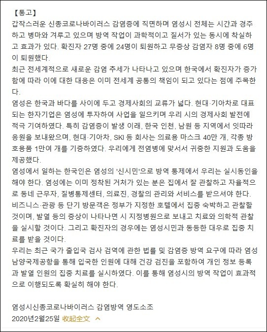 [열람중]중국 염성(鹽城)시, "한국인은 우리 시민…코로나19로 차별…