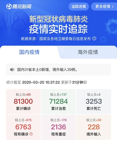 중국 국가위생건강위원회(国家卫建委)는 19일 하루 동안 전국 31개 성에서 발생한 신종 코로나바이러스(코로나19) 확진자는 39명으로 이들 모두 해외 입국자들이라고 발표했다. 사망자는 후베이 2명, 랴오닝 1명으로 총 3명이 추가 발생했다.