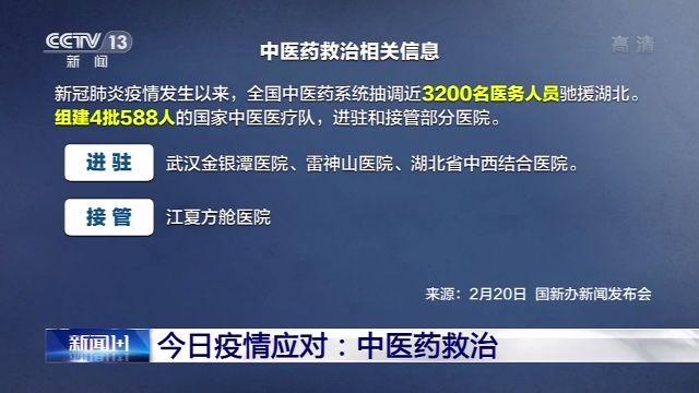 이번 방역 작전에서 전국 3200명의 의료진을 차출해 후베이(湖北)를 지원했다. 4차에 걸쳐 588명의 국가중의학의료팀을 구성해 진인탄(金銀潭)병원, 레이선산(雷神山)병원, 후베이성 중서의결합(中西醫結合)병원 등 일부 병원에 투입되어 장샤(江夏)팡창(方艙)병원 업무를 맡았다.