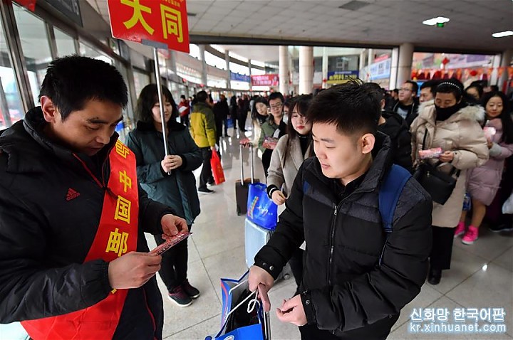 1월31일, 근로자들이 타이위안 터미널 서역에서 줄을 서서 검표하고 있다. 중국우정그룹 산시(山西)성 지사는 타이위안 터미널 서역에서 전세버스를 운영해 근로자들을 수송하는 공익행사를 하고 있다. 행사 기간, 산시 근로자 8000여명이 무료 전세버스를 타고 고향으로 가서 가족과 함께 설을 보낼 것으로 예상된다.[촬영/신화…(2019-02-04 00:43:38)