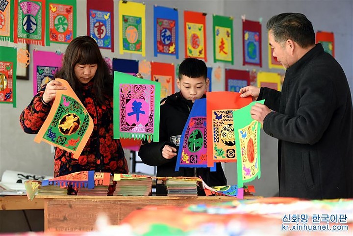 2월1일, 산둥성 탄청(郯城)현 마터우(馬頭)진 완가오처(萬高冊)촌 주민이 ‘오채문전(五彩門箋, 중국 전통의 문미 길상물)’을 정리하고 있다. 민간 페이퍼 컷팅에 속하는 ‘괘문전(掛門箋)’은 보통 색지를 오려 만들며, 춘제(春節) 기간에 문미 위에 거는 전통 장식물로 1500여 년의 역사를 가지고 있다. 사람들은 설 전…(2019-02-05 16:49:55)