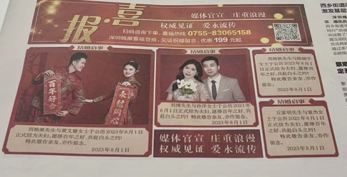 중국에서 유행중인 결혼광고는 문장으로만 간략하게 결혼을 알리는 경우도 있으며, 사진과 함께 광고를 싣는 경우도 있다.