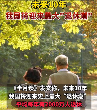 향후 10년간 중국은 사상 최대의 ‘은퇴 러시’가 찾아올 전망이라고 절강일보(浙江日报)는 27일 전했다.