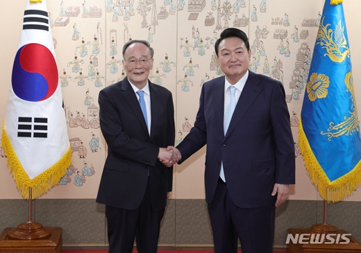 윤 대통령은 이날 오후 왕 부주석을 비롯한 중국 사절단을 서울 용산 청사 대접견실에서 만났다.