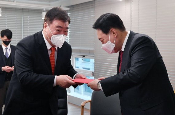 윤석열 대통령 당선인이 11일 서울 여의도 국민의힘 당사에 마련된 당선인 사무실에서 싱하이밍 (邢海明) 주한중국대사에게 시진핑(習近平) 중국국가주석의 축하 서신을 전달받고 있다.