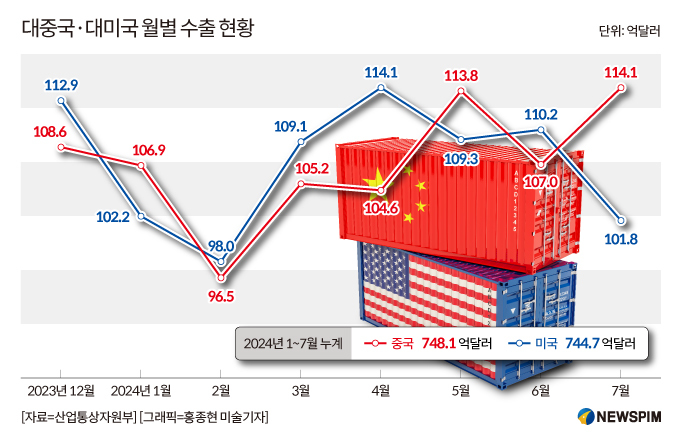 대미 수출이 대중 수출을 앞선 달이 대부분이었으나, 올해 누계 기준으로는 여전히 대중 수출이 1위 규모를 차지하고 있는 것으로 집계됐다. 올 1~7월 누계 수출액은 대중 748억1000만달러, 대미 744억7000만달러를 각각 기록했다.