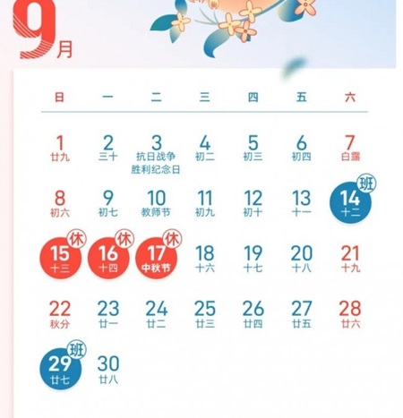 국경절의 경우 10월 1일부터 7일까지 쉬고 전 주 일요일인 9월 29일, 연휴 이후의 토요일인 10월 12일을 대체 근무해야 한다.