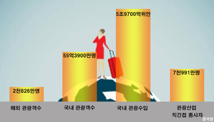 중국 문화관광부 통계에 따르면 지난해 중국 국내 관광객 수는 55억 3900만 명으로 전년 대비 10.8% 증가했고, 출입국자수는 총 2억 9100만 명으로 전년 대비 7.8% 증가했다.