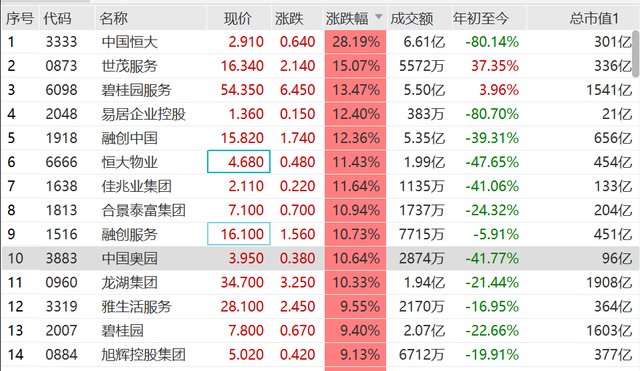 23일 오전 중국헝다(中国恒大)의 주가는 32% 급등, 헝다물업(恒大物业)은 12%, 헝다자동차는 5%, 헝다인터넷(恒腾网络)는 10% 상승했다. 헝다의 급등에 자극을 받은 다른 부동산 관련기업의 주가도 10% 이상 급등했다.