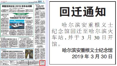 하얼빈일보 30일자 3면(왼쪽). 오른쪽 아래에 1단 크기로 안중근의사 기념관 재개관 소식이 실렸다.(오른쪽) [하얼빈일보 캡처]지난달 30일, 하얼빈 기차역으로 다시 들어선 안중근 의사 기념관이 개관했다.하얼빈안중근의사기념관은 30일 중국 현지 매체 하얼빈일보에 재개관 통지를 내고 "(임시 이전했던) 기념관이 하얼빈 …(2019-04-07 21:57:11)