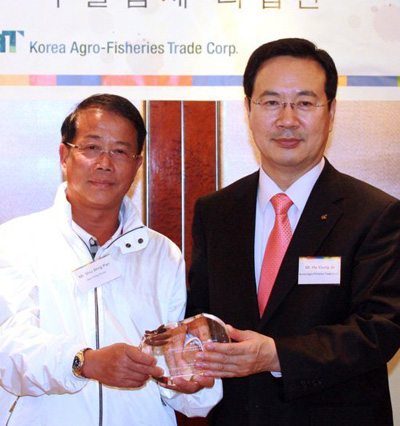 하영제 농수산물유통공사(aT) 사장이 11일 홍콩 르네상스 하버뷰 호텔에서 현지 바이어 및 한국 참가업체 대표들과 간담회를 갖고 참석한 홍콩 바이어에게 감사패를 전달하고 있다. 2011.5.11 (국제뉴스부 기사 참조)