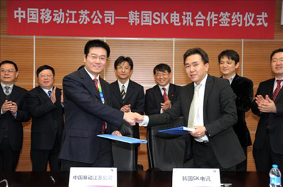 SK텔레콤은 8일 중국 장쑤성 난징(南京)시에서 차이나모바일의 게임사업을 총괄하는 장쑤(江蘇)차이나모바일과 모바일 게임 및 M2M 분야의 협력을 내용으로 하는 양해각서(MOU)를 체결했다고 10일 밝혔다.