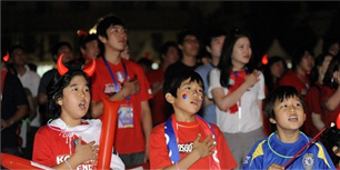 지난 남아공월드컵 때, 베이징 한국아이들이 경기에 앞서 애국가가 울려퍼지자 자리에서 일어나서 가슴을 손을 얹고 애국가를 따라 부르고 있다.