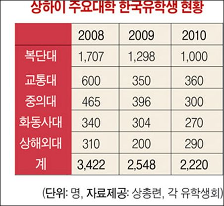 2008년 금융위기 이후 상하이 한국 유학생 수가 해마다 줄어들고 있다. 올해 신학기를 맞아 상하이 주요 5개 대학 한국유학생 수를 조사한 결과, 지난해에 보다 13% 감소한 것으로 나타났다.