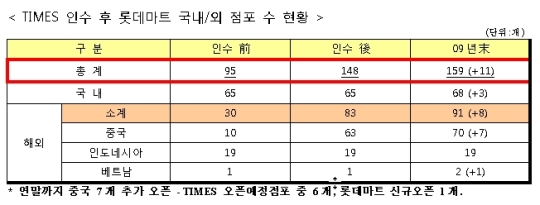 ◇롯데마트 대형마트 점포수 기준 '국내 1위' 올라=롯데마트는 중국 대형유통업체인 타임스를 인수하게 되면서 국내 65개점, 해외 83개점 등 총 148개 대형마트를 보유하게 돼 국내 124개, 중국 22개 등 모두 146개 매장을 갖고 있는 이마트를 제치고 점포 수 기준으로 국내 대형마트 업체 중 1위로 올라서게 된다고 밝혔다.