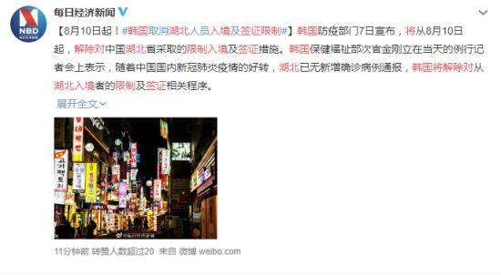 한국 10일부터 중국 후베이 입국 제한 해제[2020-08-07, 14:48:09] 한국 방역당국이 오는 10일부터 중국 후베이(湖北)성 지역 사람들에 대한 입국, 비자 제한 조치를 해제한다고 7일 밝혔다. 7일 중앙TV뉴스(央视新闻)는 김강립 한국보건복지부 차관이 7일 열린 기자회견에서 이 같이 밝혔다고 보도했다…(2020-08-08 02:50:08)