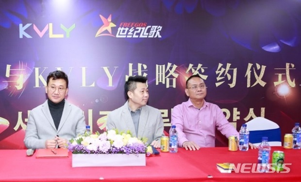 브이티지엠피 관계사 케이블리와 중국 공연기획사 프리고스 간 합작법인 설립 계약 체결식에 참석한 안우형 케이블리 대표(왼쪽)와 허빈 프리고스 대표(가운데).2020.01.13. jey@newsis.com (사진=브이티지엠피 제공)