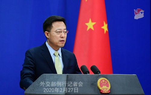 27일 열린 외교부 정례 기자회견에서 ‘환구시보’ 기자가 자오리젠(趙立堅) 대변인에게 최근 한국 감염 사태가 심각해지는데 중국은 한국 측에 지원 의사가 있는지? 최근 며칠 중국 일각에서 한국 감염 유입을 염려하고, 한국 일각에서는 중국이 과도하게 반응하고, 한국 측 지원에 대한 보답도 하지 않았다며, 양국 국민 정서에 일정 영향을 미쳤다. 중국은 이를 어떻게 보는지?에 대해 질문했다.