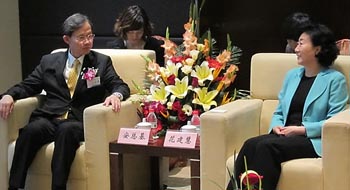 중국 동부 내륙 지역인 안후이(安徽)성은 8일 성도인 허페이(合肥)시에서 40여개 한국 기업을 대상으로 투자 설명회와 기업인 상담회를 개최했다. 안총기 상하이총영사(왼쪽)와 화젠후이(花建慧) 안후이성 부성장이 설명회를 통해 한국 기업투자에 대해 의견을 나누고 있는 모습.(김대호)(2011-11-09 07:56:39)