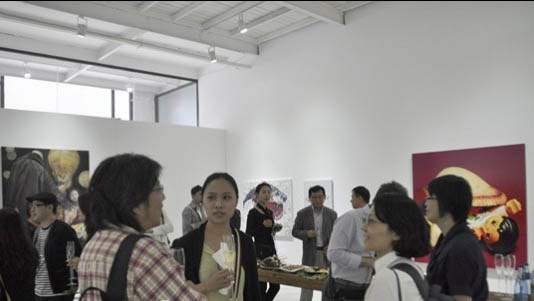 ▲ 9일 개최된 '데카메론' 전시회 오프닝에 참석한 한중 예술계 관계자들이 작품을 감상하며 담소를 나누고 있다