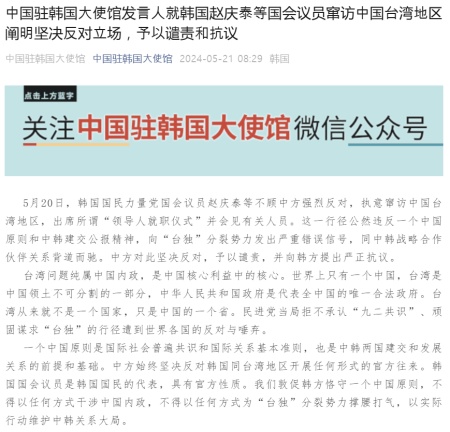 21일 주한 중국대사관 대변인은 위챗 공식 계정을 통해 ‘한국 조태경 등 국회의원의 중국 타이완 지역 방문에 대해 결사적 반대 입장을 밝히며 이를 규탄하고 항의한다’는 제목의 입장문을 발표했다.