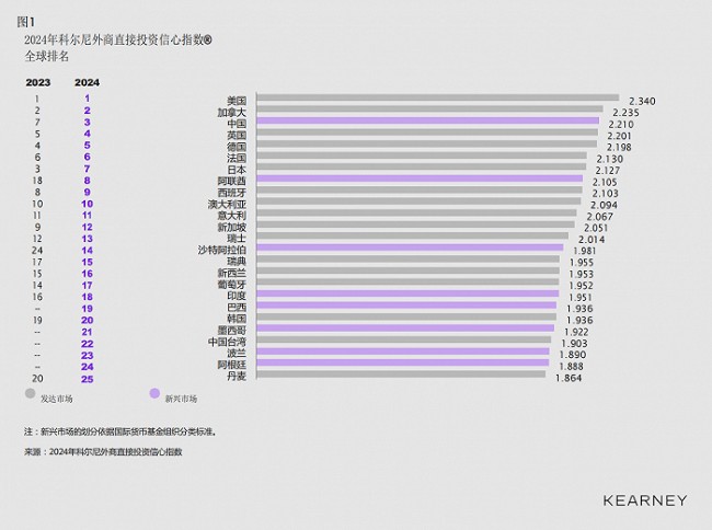글로벌 컨설팅 기업 AT커니가 발표한 ‘2024년도 해외 직접 투자 신뢰 지수(FDICI)에서 중국이 3위로 올라섰다고 8일 계면신문(界面新闻)이 전했다. 향후 3년 동안 중국이 투자지로서 갖는 매력이 상승했음을 의미한다. 게다가 지난해 7위였던 순위가 올해는 3위까지 상승하면서 신흥시장에서 가장 높은 순위를 기록했다.
