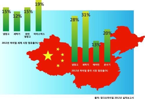 사진은 2012년 하이얼의 중국과 세계 시장에서의 점유율을 나타낸 그래프다.