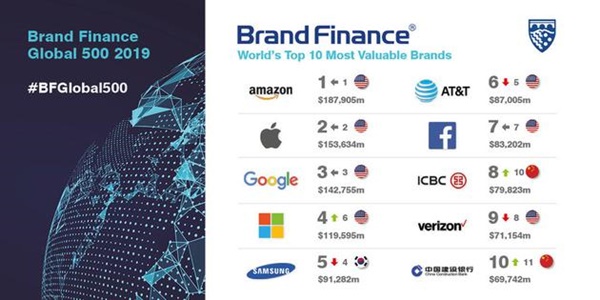 1위는 브랜드 가치를 24.6%를 상승시킨 아마존(1879억 500만 달러)이 지난해에 이어 선두 자리를 지켰다.