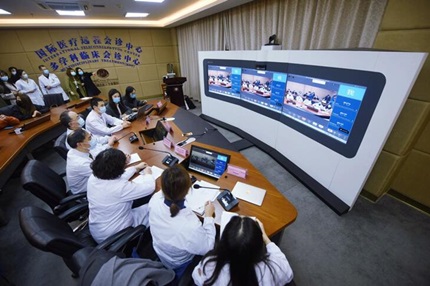 (杭州)시 적십자사 병원 원격회진센터에서 중국 의료 전문가들이 멕시코 의료 전문가들과 코로나19 치료와 방역 방안을 교류하고 있다. [사진 출처: 인민포토]
