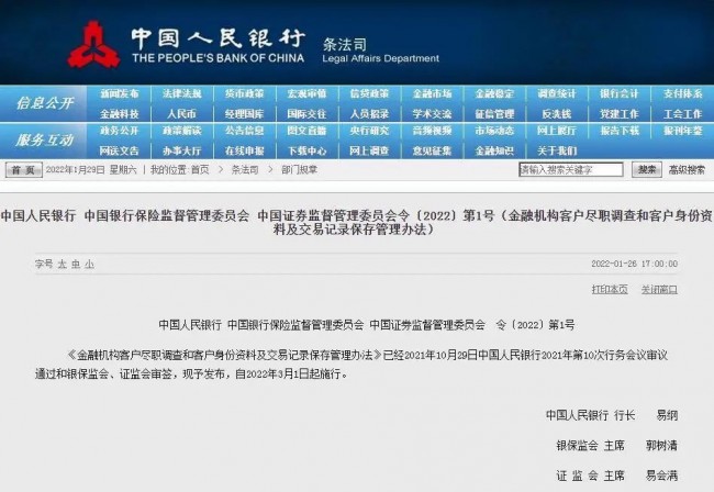 최근 인민은행, 중국은행 보험감독관리위원회, 중국증권감독관리위원회의 3개 부처는 공동으로‘금융기관의 고객 실사 및 고객 신원정보 및 거래기록 보존에 관한 관리방법’을 발표하고, 금융기관의 고객 실태 조사, 고객 신원정보 및 거래기록 보존 행위를 규범화했다고 광주일보(广州日报)는 7일 전했다. 이번 조치는 오는 3월 1일부터 시행에 들어간다.