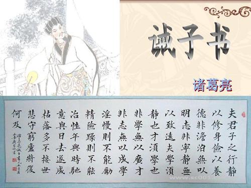 제갈공명이 54세에 죽음을 앞두고 8세인 늦둥이 아들 제갈첨(諸葛瞻 227~263)에게 보낸 86자 편지를 계자서(誡子書)라 부르는데, 소학(小學)에 전문을 실어 놓아 역대 중국 가정의 자녀교육에 매우 큰 영향을 미친 글이다.
