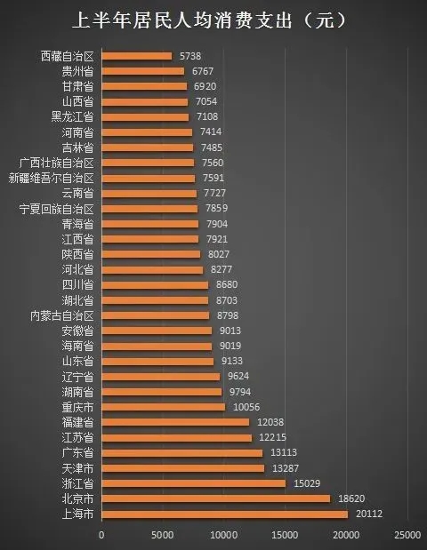 중국에서 소비지출이 가장 적은 도시는 시장(西藏)으로, 올 상반기 1인당 평균 소비지출이 5738위안(98만 원)에 그쳤다.