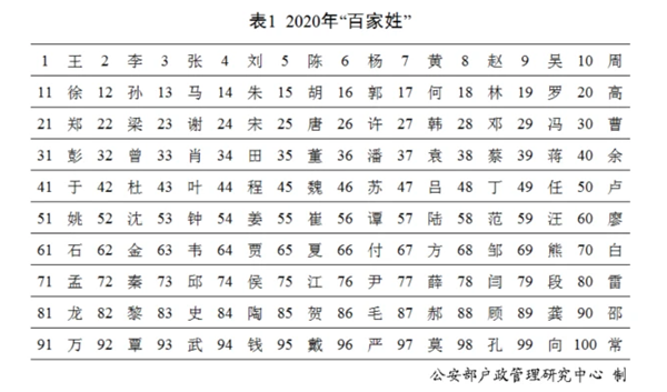 2020년 중국 ‘백가성’ [사진 제공: 중국 공안부 호적관리연구센터 지난 8일 중국 공안부는 ‘2020년 전국 성명 보고’를 발표했다. 호적 인구수를 기준으로 2020년 중국의 ‘백가성’(百家姓)은 2019년과 비교해 크게 달라지지 않았다. ‘왕’(王), ‘리’(李), ‘장’(張), ‘류’(劉), ‘천’(陳)이 차…(2021-02-10 12:30:12)