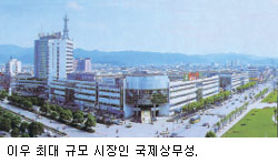 이우 중국 저장성 한복판에 있는 도시로 상하이에서 350km, 항저우에서 150km, 닝보에서 200km 떨어졌다. 도농복합 행정구역으로 도시지역 인구는 70만 명이며, 외국인을 포함해 매일 평균 20여만 명의 외지인이 방문한다. 개혁·개방 초기인 1982년 공예품 장터에 세금 혜택을 주면서 현대식 시장도시로 발전했다. 지난해까지 매년 20%의 성장을 계속해 왔다. 시 당국에 따르면 2006년 시장 교역액이 388억 위안(약 7조7600억원)에 이른다.