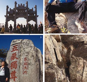 ▲ 1태산 천가엔 항상 사람들로 붐빈다./2칼바위능선이 끝나면 여성 상징 바위가 바로 눈앞에 나온다. /3정상에 오악독존이라 새겨진 마애석./4여성 상징 바위를 불과 10m 채 안 되는 거리에서 마주보고 있는 남성 상징 바위.