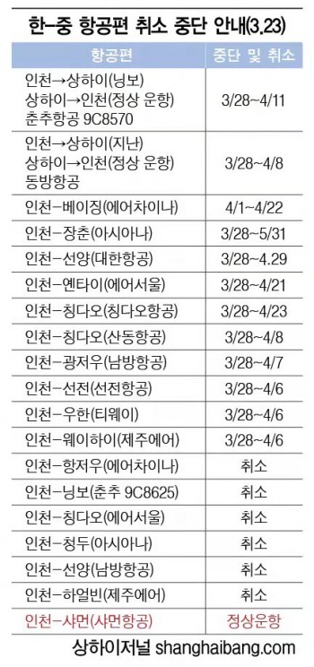 [열람중]사실상 中韓 하늘길 상황 … 샤먼 외 전 노선 일시 중단