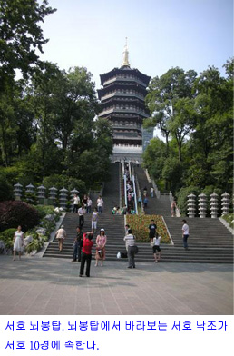 항저우 뇌봉탑에 간 것은 오후 4시께였다. 뇌봉탑은 서호 남쪽에 있는 탑으로 정자사(淨慈寺) 앞 석조산(夕照山) 위에 있다. 송나라 개보8년(975년)에 오월왕 전숙이 지었는데 처음에는 서관전탑(西關塼塔)이라 하였고 나중에 '왕비탑'으로 이름이 바뀌었다. 뇌봉의 작은 산 위에 있어 대개는 '뇌봉탑'이라 부른다.