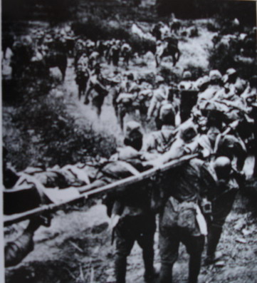 청산리전투에서 부상자를 들것에 실어나르는 일본침략군
