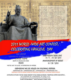 565돌 한글날을 맞이해 한글의 독창성과 아름다움을 알리기 위한 미술대회가 펼쳐진다. 재미한국화가회는 “11월 20일까지 상상력과 창의력을 바탕으로 한 한글 주제 그림 공모전 ‘2011 한글날 기념 세계미술대전’을 위한 작품을 모집한다”고 밝혔다. ‘한글과 한국의 아름다움’을 주제로 한 이번 공모전은 세계 각지에…(2011-08-18 10:13:33)