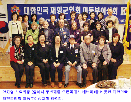 대한민국재향군인회 미동부여성지회 신임회장에 안지영씨가 추대됐다. 대한민국재향군인회 미동부여성지회는 1일 버지니아 소재 펠리스식당에서 2011년 정기 총회 및 이·취임식을 가졌다. 신임회장으로 추천된 안지영씨는 “여성회가 향군을 위해 무엇을 할 것인지 국가안보에 어떻게 기여를 할 것인지를 서로 고민하면서 함께 발전…(2011-04-07 10:04:21)