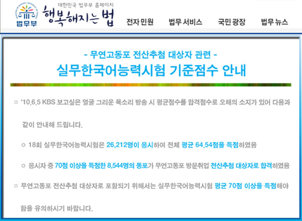 한국 법무부는 지난 6월 5일 KBS 보고싶은 얼굴 그리운 목소리 방송 시 평균점수를 합격점수로 오해의 소지가 있어 다음과 같이 안내했다.