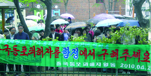 '중국 동포 피해자를 함정에서 구해 주세요'란 플래카드를 들고 대한법률 구조공단을 찾은 재한 조선족 피해자들.
