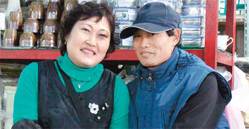 한옥선 씨(왼쪽)가 자신이 운영하는 제주시 도두동 5일장 그릇가게에서 남편 이영휘 씨와 다정하게 밝은 미소를 짓고 있다. 한 씨는 동네 대소사에 앞장서며 ‘이주여성 부녀회장’으로 유명해졌다.