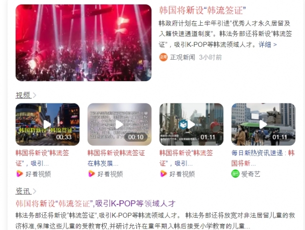 외국 국적의 문화 인재를 붙잡기 위해 신설될 예정인 ‘한류 비자’ 소식에 중국이 들썩이는 분위기다. 중국 유력매체 시나뉴스 등 다수의 언론들은 일명 ‘한류 비자’로 불리며 K-POP 등 문화 분야 인재 유치를 목적으로 한 한국의 비자 신설 소식을 2일 일제히 전했다. 이 매체들은 한국 연합신문 등의 보도를 인용해 ‘(…(2022-01-09 17:33:15)