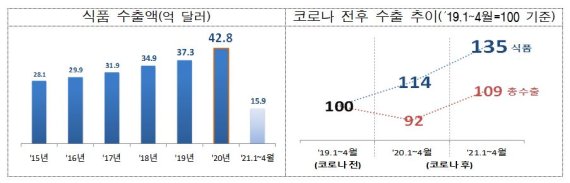 지난해 한국의 식품 수출이 총 43억 달러로 역대 최고액을 찍었다. 코로나19로 전체 수출액이 일시 감소한 상황에서도 한류 열풍에 힘입어 전년 대비 14%이상 늘었다.