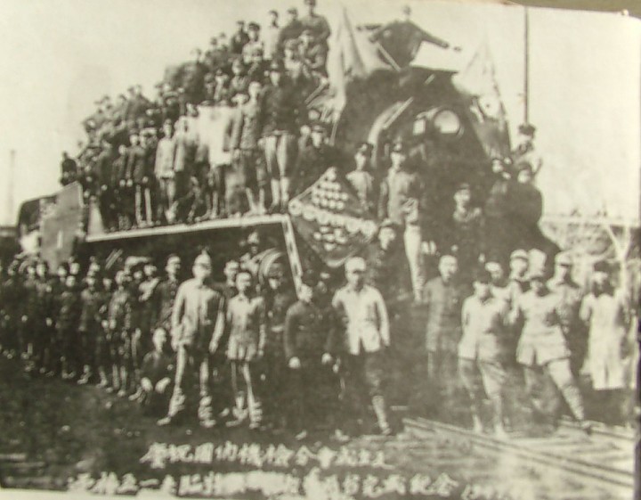도문철도 로동자들 “5.1”절을 맞아 두대의 기관차를 수리하고 남긴 기념사진(1947년 4월)