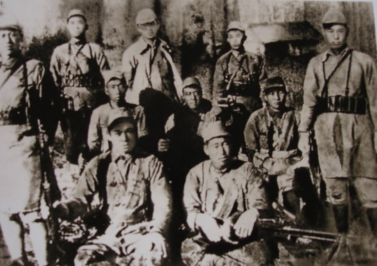 동북항일련군 제1로군 제2군 제6사의 조선인장병들. 뒤줄 중간에 선 사람 김일성.