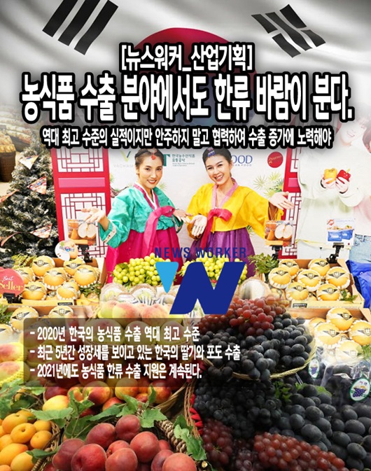 코로나19의 영향에도 불구하고 2020년 기준 한국은 역대 최고 수준인 75.7억 달러 규모의 농식품을 수출하는 것에 성공했다.