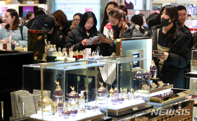 이영환 기자 = 중국 선양 건강식품·보조기구 제조회사인 이융탕(溢涌堂) 임직원 및 관광객들이 10일 오후 서울 용산구 신라아이파크면세점을 찾아 쇼핑을 하고 있다. 이융탕 임직원 5000명이 지난 7일부터 5박 6일간 인센티브 관광을 왔으며 단체 관광객 규모로는 한한령이 시작된 2017년 이후 단일 규모로는 최대이다. 2020.01.10.